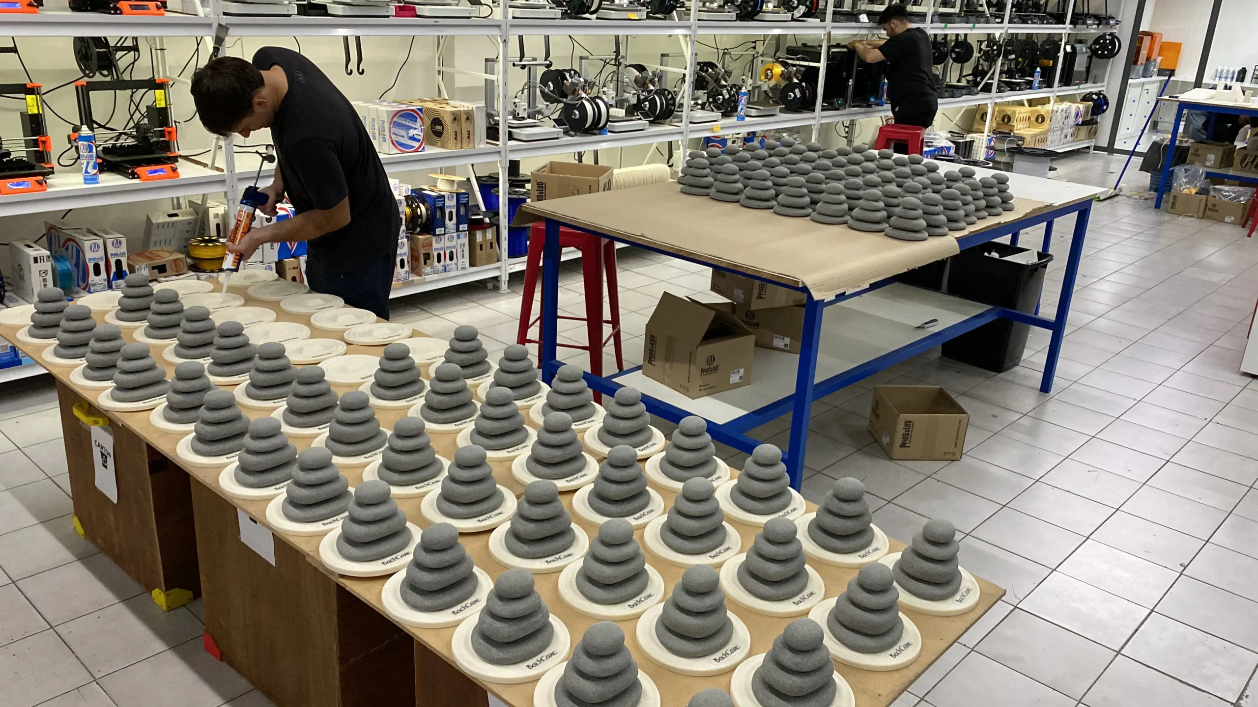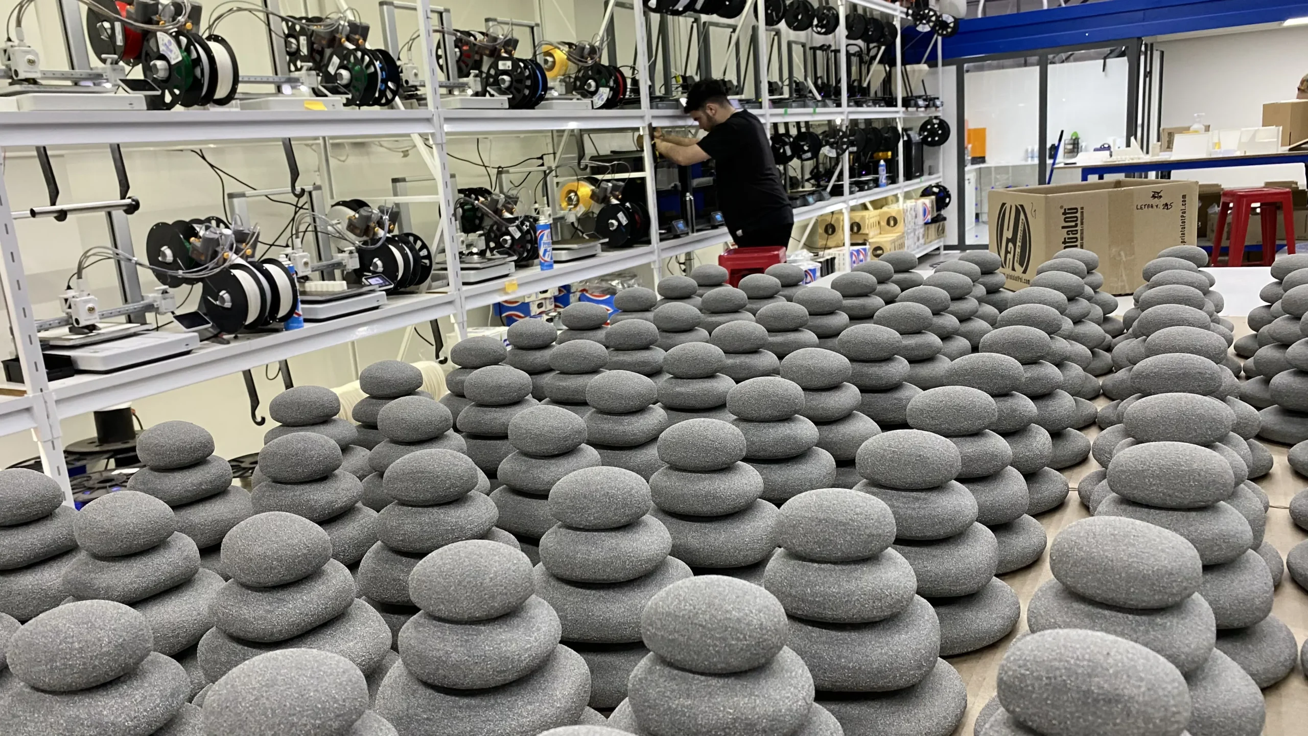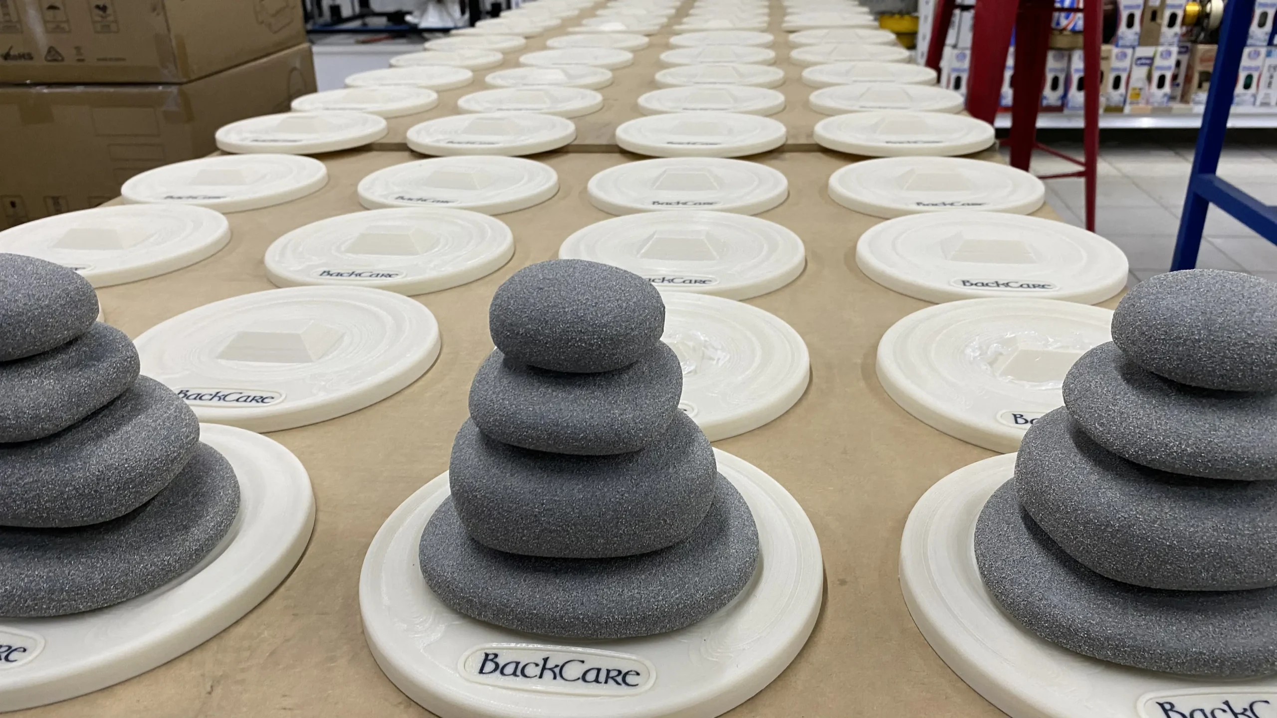 Trabajamos en muchos bocetos digitales y reales hasta que el cliente quedó satisfecho. Evaluamos un montón de alternativas de diseño, formas, colores, pinturas y métodos de fabricación.Por suerte llegamos a tiempo y las piedras ya están en todos los locales.